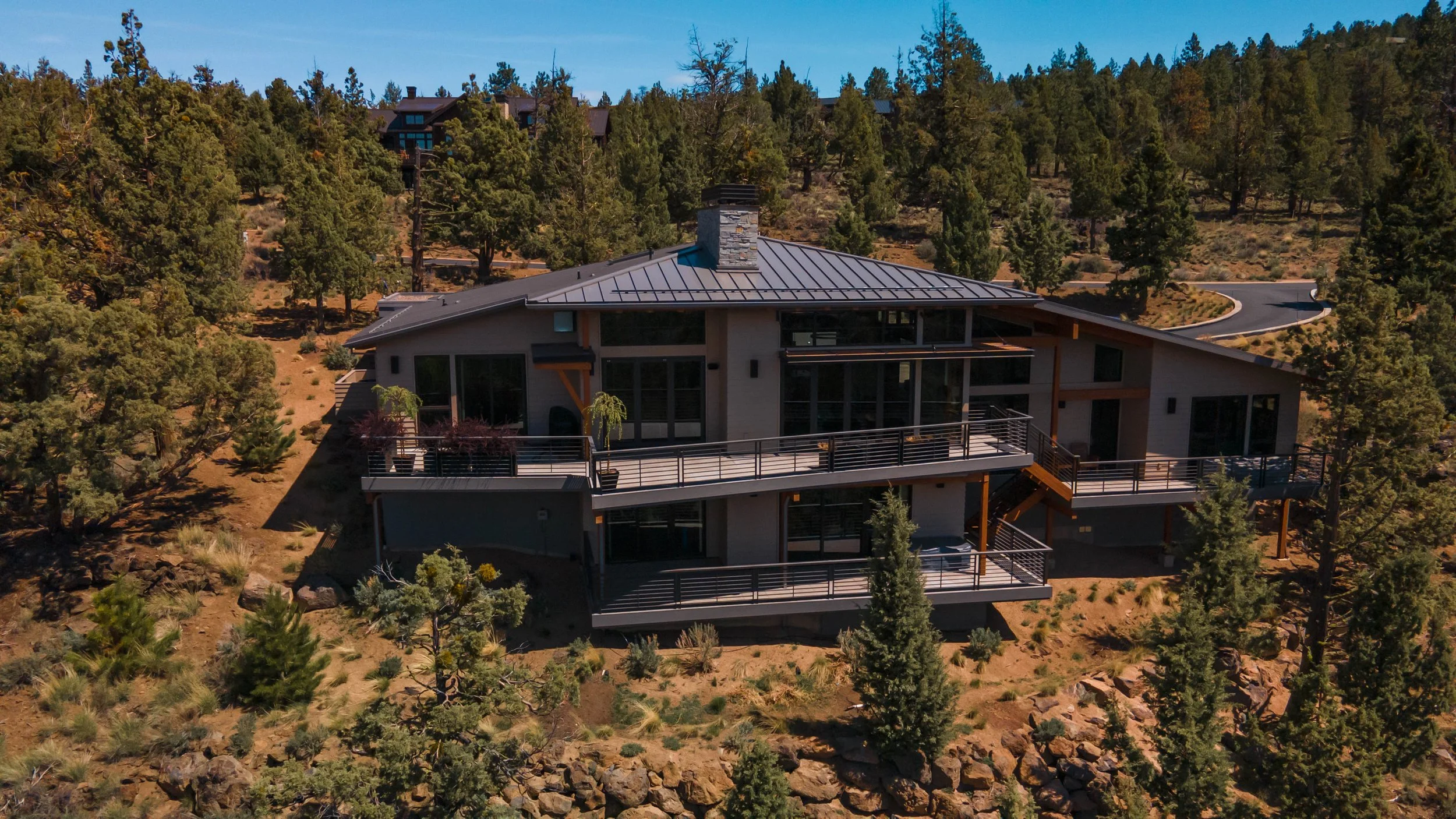 Steep sites are inherently challenging in terms of such goals as organizing living spaces vertically to accommodate client life styles and addressing reasonable access for vehicles and people. However, more often than not there are also benefits such as open view vistas, uninhibited access to natural light and affording a sense of floating within the landscape. This home was designed to engage all such benefits.